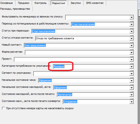 ВАЖНО! У каждого клиента должна быть указана категория, если используются соотв. фильтры. Категория по умолчанию задается в справочники - структура компании - значения по умолчанию, вкладка «маркетинг», она используется для НОВЫХ клиентов. Существующим можно назначить категорию через групповую обработку (в справочнике контрагентов меню «действия — служебные», вкладка «замена»).