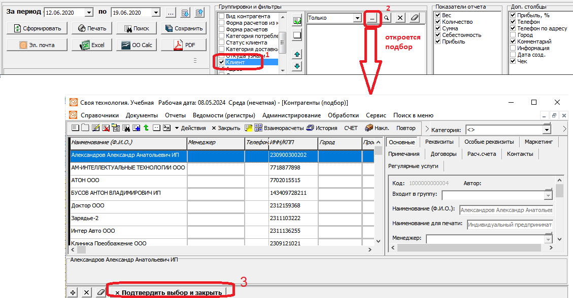 и в открывшемся окне подбора добавляем одного или несколько клиентов в нижний список, затем подтверждаем установку фильтра.