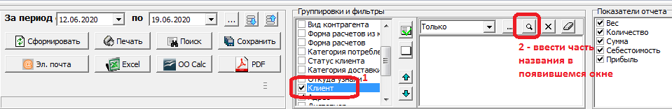 Далее есть 2 способа поставить фильтр. Первый - правее группировок (около слова «только») нажимаем либо «…» и затем щелчком мыши набираем в фильтр, расположенный внизу открывшегося списка справочника, набрав все нужные нажимаем «подтвердить выбор и закрыть». Второй - там же нажимаем не «…», а лупу и вводим часть названия (например, «розница»). Подберутся все записи, содержащие нужное слово.